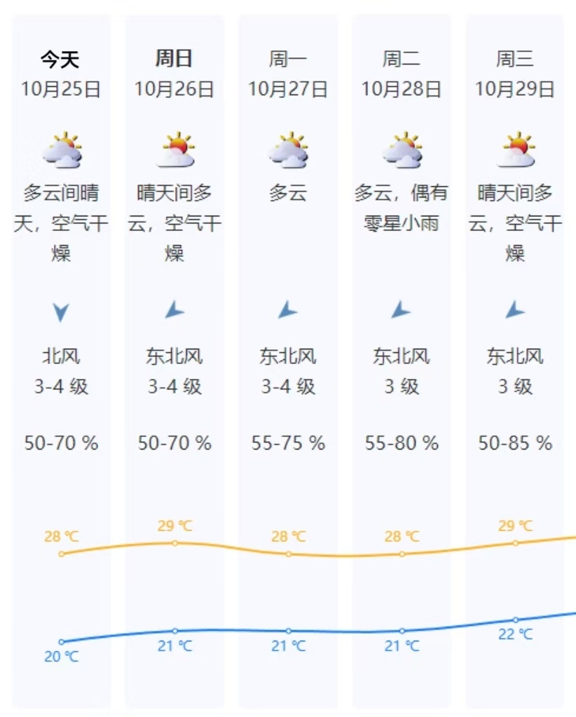 【周六天气】多云到晴天,空气干燥,沿海、高地和海区最大阵风6级左右,气温回升,气温20-28℃。