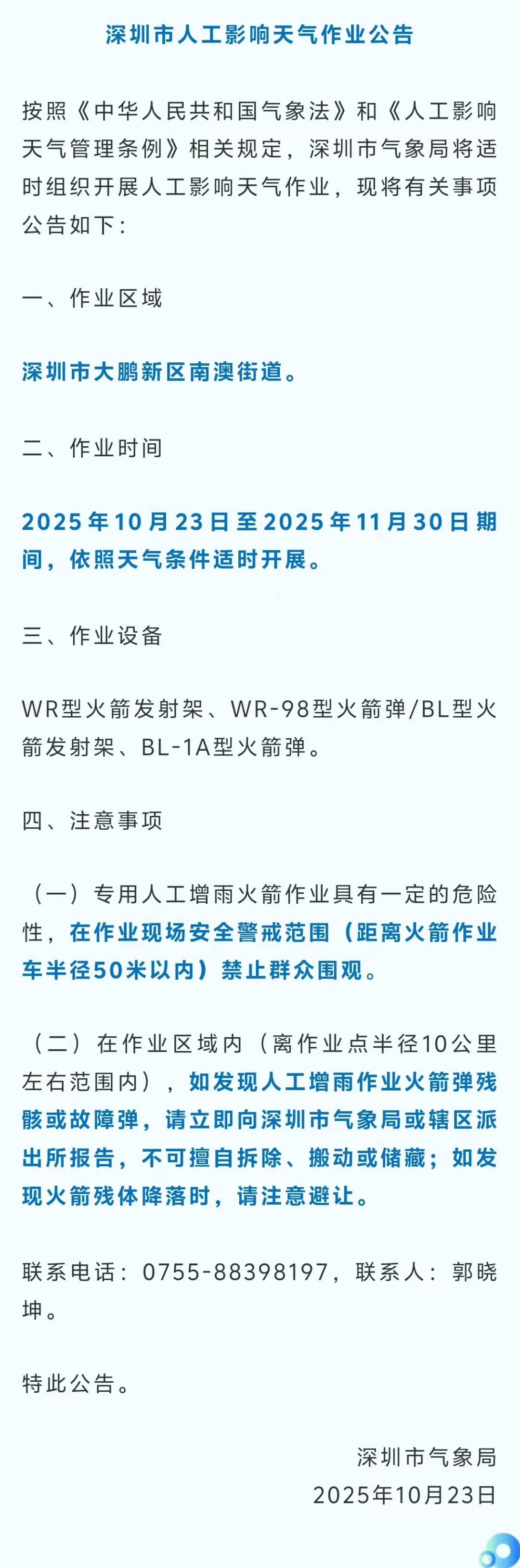 注意了!10月23日,深圳市气象局发布公告,将适时组织开展人工影响天气作业。